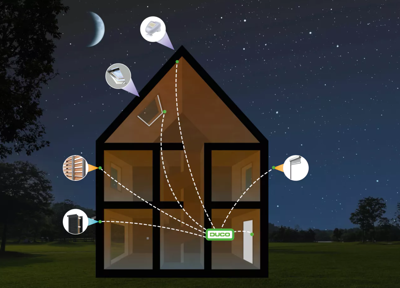Avec Duco Natural Cooling, vous profitez d’un confort intérieur optimal tout au long de l’année. Ce concept intelligent combine refroidissement passif par flux d’air naturel et protection solaire active. Une station météo analyse température, luminosité et vent, tandis que la Duco IntelliHub commande automatiquement volets, fenêtres de toit et stores. Les grilles assurent une ventilation naturelle et les toiles solaires bloquent la chaleur. Confort maximal sans énergie.